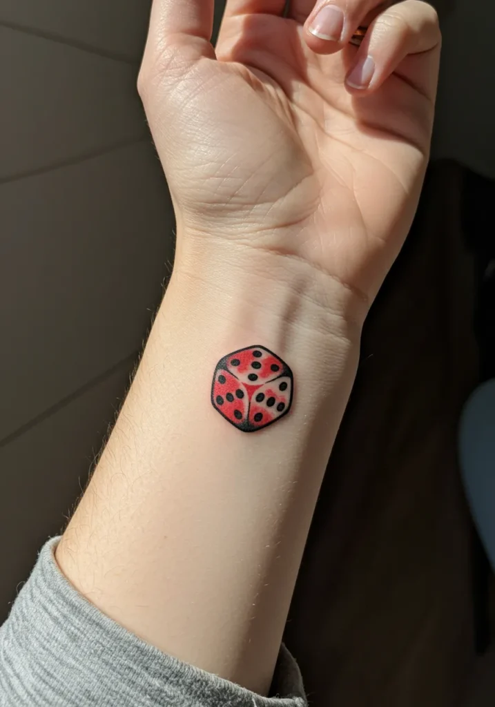 This small tattoo on the wrist features a bright red die outlined in black, done in the classic American traditional style. The tiny size gives it a cute, playful feel, but the bold color still makes it stand out. It’s simple, clean, and full of personality.