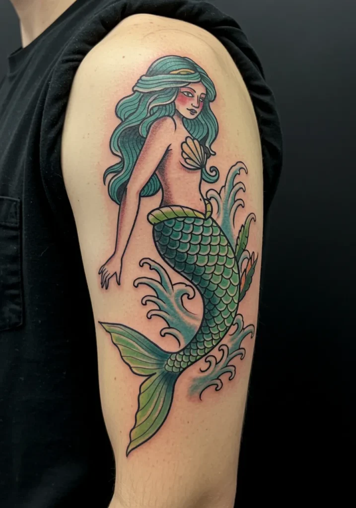 This stunning mermaid tattoo stretches along the upper arm, showing a graceful figure with teal-green hair, shimmering scales, and waves swirling around her tail. The bold outlines and soft gradient shading keep the traditional style alive while giving it a magical ocean vibe.