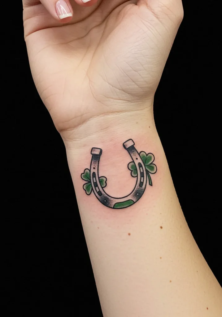 This adorable wrist tattoo features a classic silver horseshoe framed by two bright green clovers. It’s compact and neatly placed on the inner wrist, giving it a polished yet playful vibe. The shading gives the metal a realistic touch, while the pops of green bring life and good fortune energy into the design.