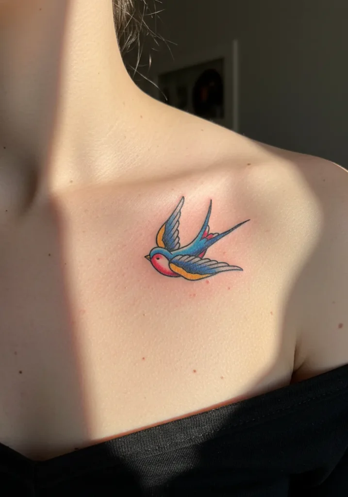 Placed delicately just below the collarbone, this small sparrow tattoo feels light and free. The design mixes baby blue wings with soft yellow and pink tones, outlined in solid black lines that keep that old-school charm intact. Its petite size makes it perfect for anyone who loves subtle tattoos that still have a pop of color.