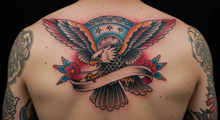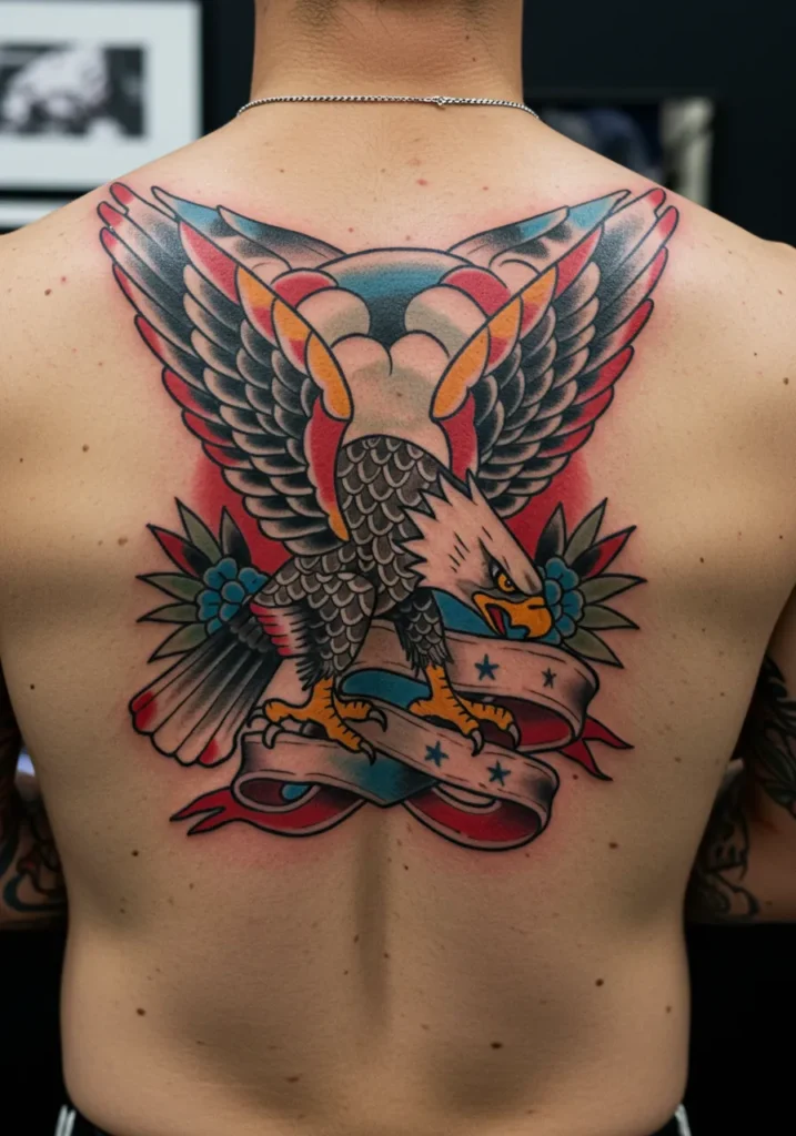 This large back tattoo commands attention with its fierce bald eagle, wings spread wide in full color glory. The traditional red, blue, and yellow tones give it that unmistakable Americana flair. The banner beneath the eagle and the surrounding flowers add balance to its powerful stance, turning the entire back into a canvas of pride and strength.