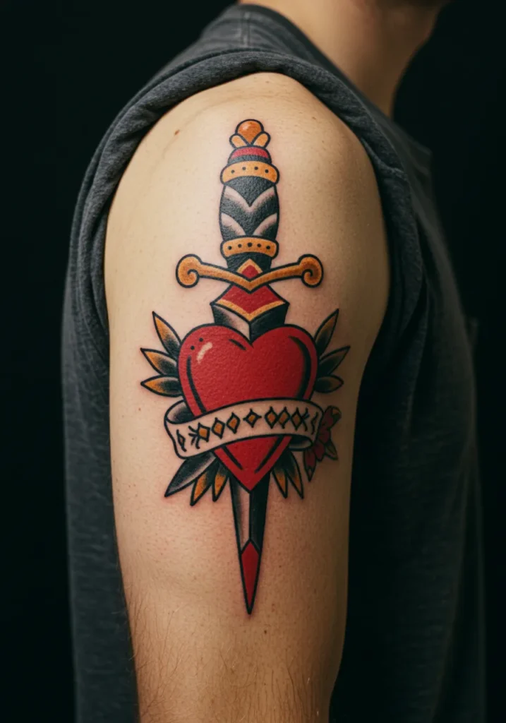 This striking piece on the upper arm shows a red heart pierced by a dagger, framed with green leaves and gold detailing. It’s a large traditional tattoo done in the signature bold style—thick black lines, heavy shading, and bright red that stands out beautifully against the skin. The banner wrapping the heart adds an old-school vibe that never feels outdated.