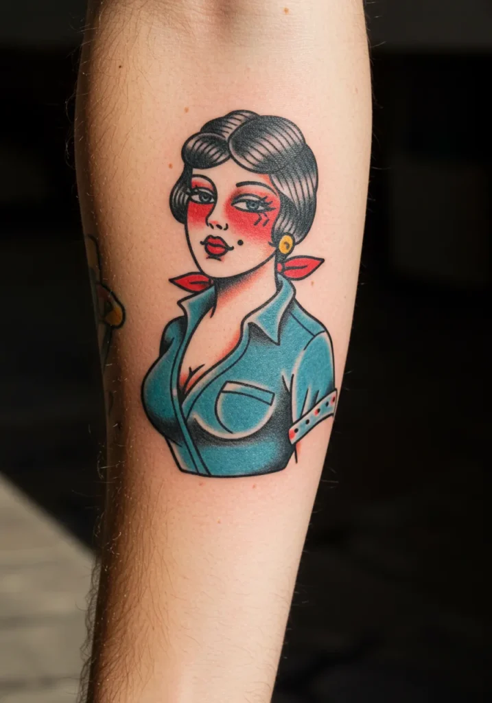 This tattoo features a classic pin-up girl with jet-black hair, bold red lipstick, and a teal collared shirt. Placed on the forearm, it’s mid-sized and uses warm tones of red and gold that complement the cooler shades of blue. The clean outlines and confident pose make it instantly recognizable as pure American Traditional art.