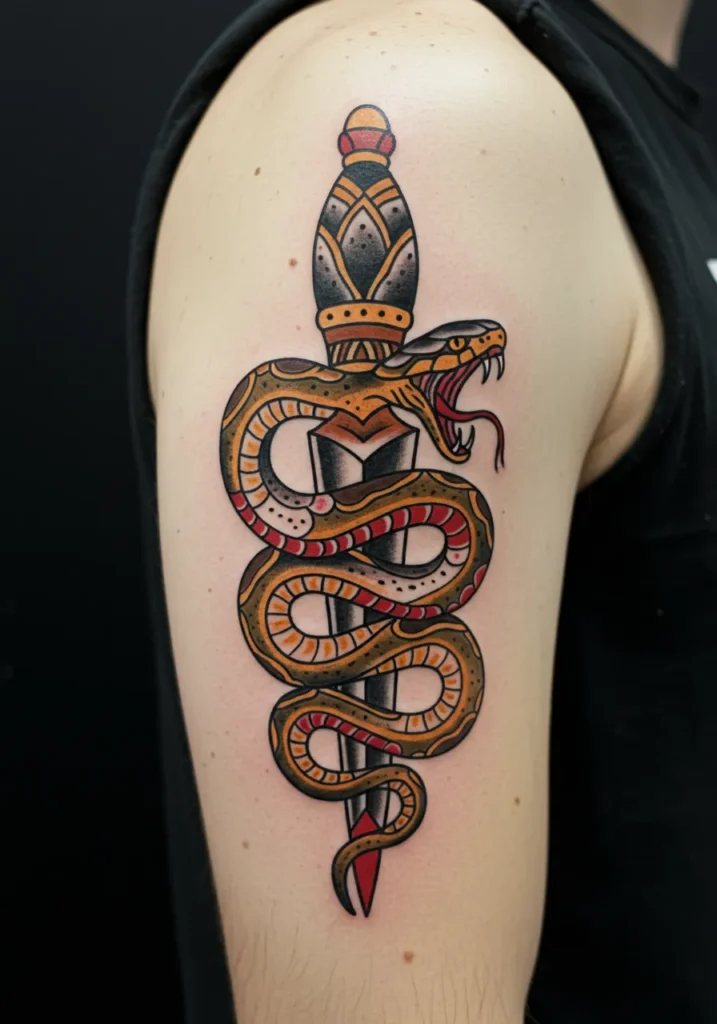 This large shoulder tattoo features a coiled snake wrapped tightly around a dagger, its fangs bared and tongue out in vivid red. The scales shift between golden yellow and burnt orange, outlined in deep black for bold contrast. The dagger’s handle is detailed with traditional geometric shapes, giving the piece a powerful, old-school balance.