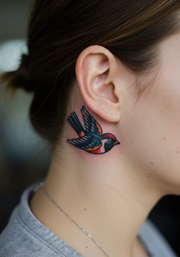 This small bird tattoo sits just behind the ear, done in a traditional palette of black, orange, and hints of red. Despite its tiny size, the clean lines and careful shading make it pop beautifully. It’s subtle yet expressive, adding a bit of personality in such a delicate spot.