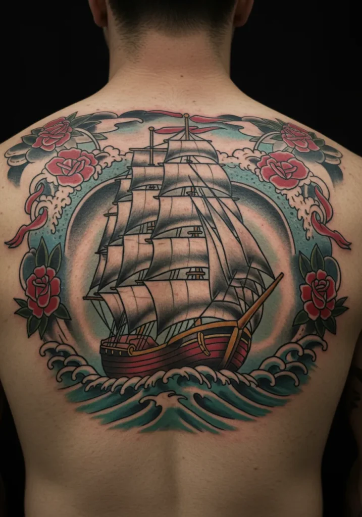This stunning back piece features a majestic sailing ship with full white sails surrounded by ocean waves and framed by red roses. The tattoo fills the upper back with perfect symmetry, using classic American Traditional shades of blue, red, and black to create depth and motion. Each line is clean and bold, giving the ship a sense of power and timeless adventure.