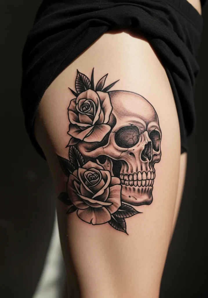 This black and grey thigh tattoo blends a beautifully shaded skull with two blooming roses. The fine gradients give the skull realistic depth, while the leaves and petals soften the overall look. It’s large but elegant, showing how traditional tattoo artistry can balance dark and delicate elements at once.