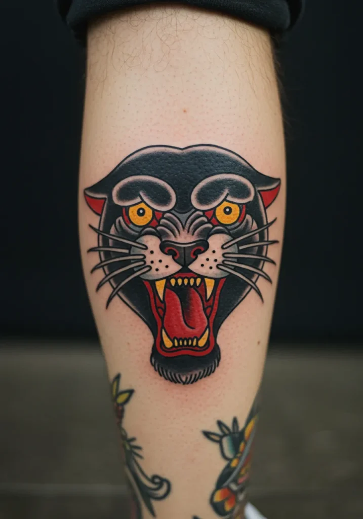 This bold calf tattoo shows a roaring black panther head with fiery red inside the mouth and bright yellow eyes that seem to glow. The clean black outlines and sharp color contrast make it pop right off the skin. Every detail screams confidence and power in that classic old-school way.