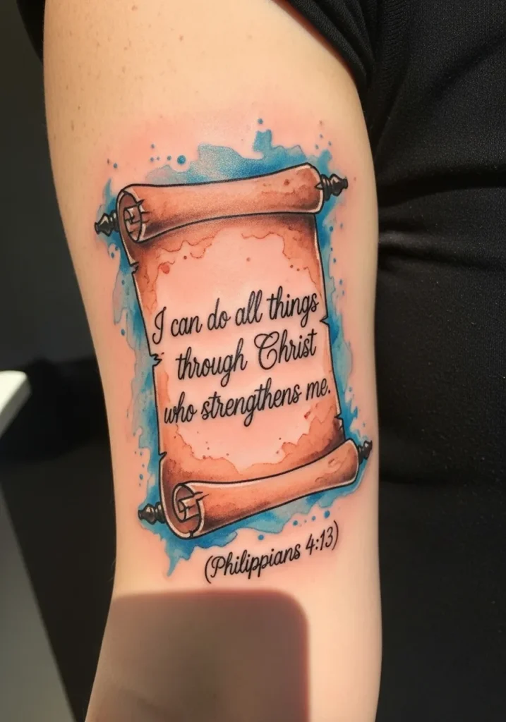 This tattoo shows a medium sized scroll design on the upper arm, done in a watercolor inspired style with warm parchment tones and soft blue accents. The text sits naturally within the scroll, and the edges look slightly worn for a timeless feel. The placement allows the design to stand out while still feeling balanced.