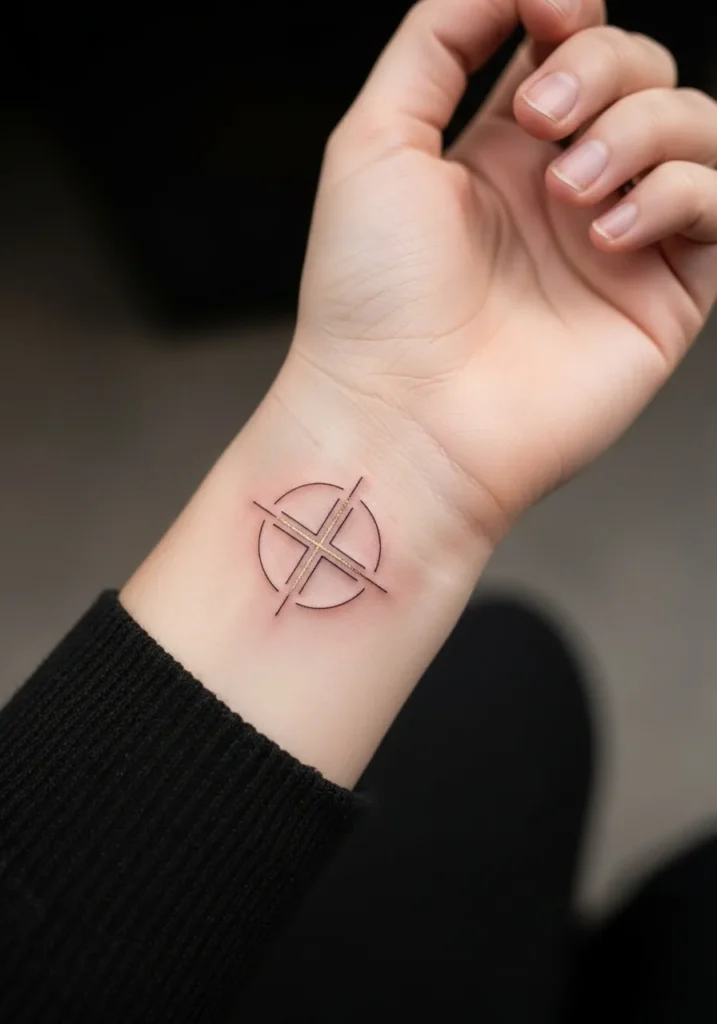 This tattoo features a small cross on the inner wrist, created with fine line work and subtle neutral shading. The lines are clean and understated, giving the design a modern and gentle look. Its size and placement make it easy to keep close and personal.