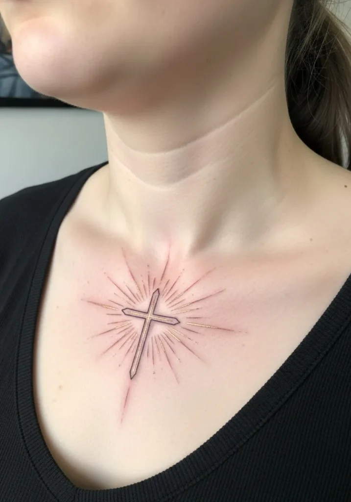 This tattoo shows a medium sized cross placed at the center of the chest, surrounded by soft radiating lines in warm neutral tones. The fine line style keeps it elegant, while the placement makes it feel strong and intentional. The shading is subtle and smooth.