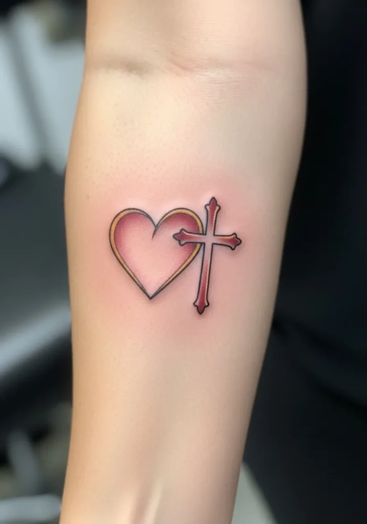 This tattoo features a small heart and cross combination on the forearm, done in soft reds and muted browns. The lines are clean and slightly rounded, giving the design a gentle and approachable look. The size makes it noticeable without overpowering the arm.