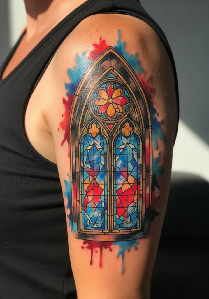 This tattoo shows a large stained glass window inspired design on the upper arm, created in a neo traditional style with rich blues, reds, and golden tones. The bold colors and defined lines give it a dramatic yet artistic look. The placement makes it feel like a true statement piece.