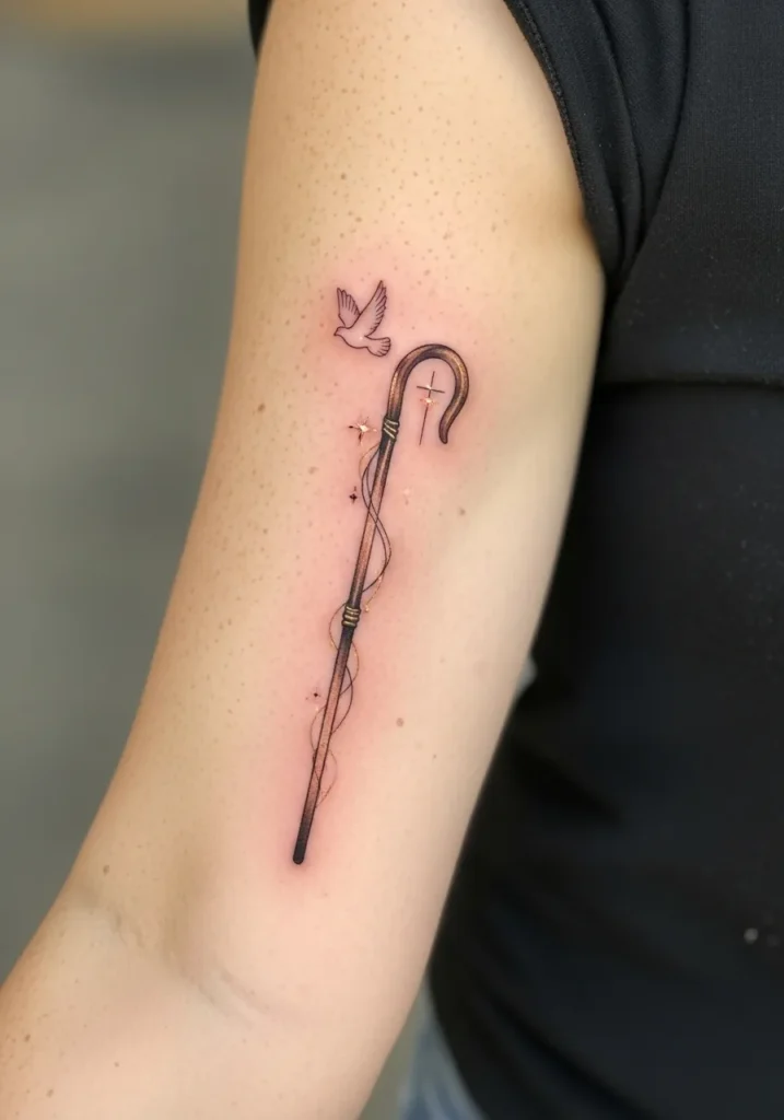 This tattoo features a small shepherd staff placed along the upper arm, done in fine line style with soft brown and muted gray tones. The design is slender and minimal, with gentle shading that adds depth without making it heavy. The size feels subtle and intentional, making it a quiet symbol rather than a bold statement.