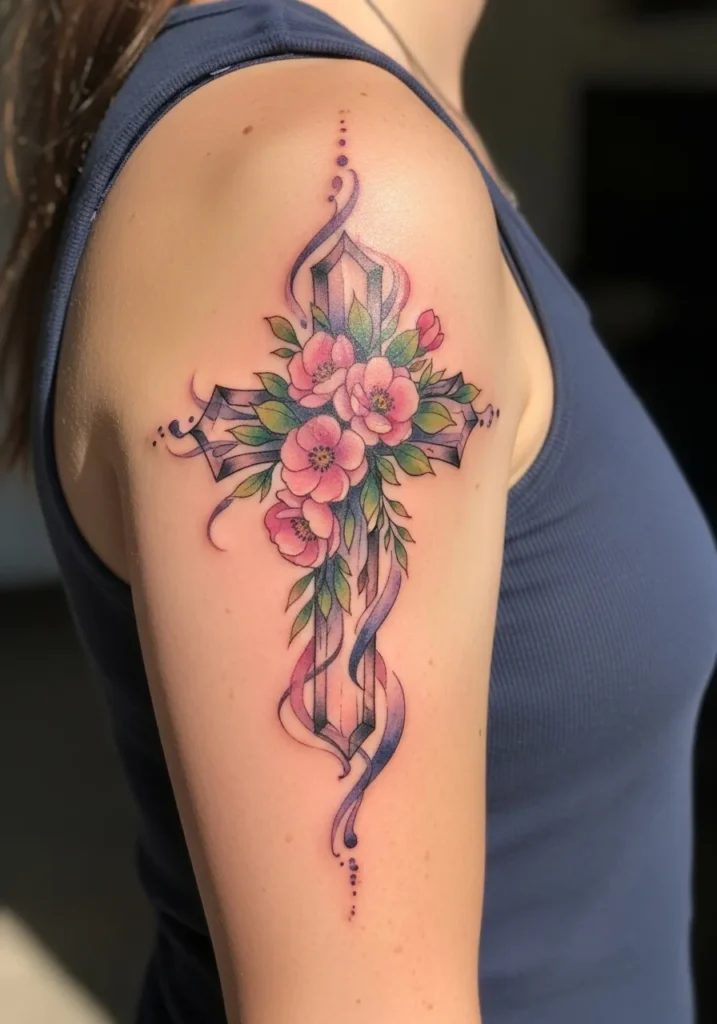 This tattoo shows a medium sized cross on the upper arm, surrounded by blooming flowers in soft pinks and warm greens. The style blends fine line structure with watercolor movement, giving it an artistic and expressive feel. The placement lets the design flow naturally with the arm.