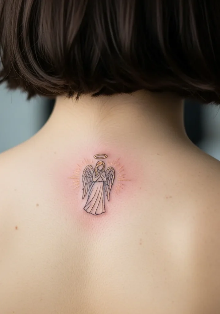 This tattoo features a small angel placed at the upper back near the nape of the neck, done in fine line style with subtle blush and neutral tones. The details are soft and delicate, keeping the design light and intimate. The placement feels personal and slightly hidden.