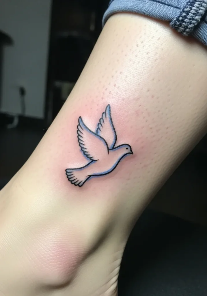 This tattoo features a small dove on the outer ankle, done in fine line style with soft gray and pale blue accents. The wings are slightly spread, giving the bird a peaceful sense of motion. The placement keeps it light and elegant.
