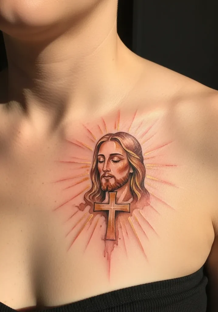 This tattoo shows a medium sized portrait of Christ on the upper chest, surrounded by soft radiating light in warm gold and blush tones. The style leans toward realism with artistic shading, creating depth and emotion. The placement makes it feel powerful and heartfelt.
