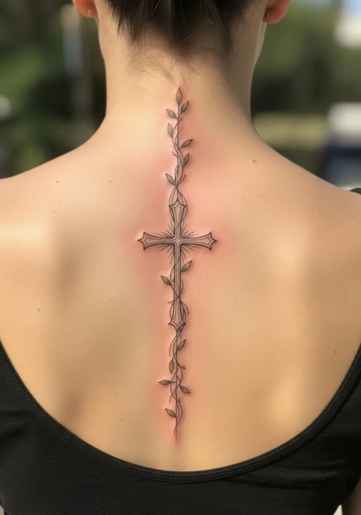 This tattoo runs vertically along the spine, featuring a fine line cross intertwined with delicate vines in muted greens and soft browns. The length follows the natural line of the back, creating an elegant and balanced look. The size is medium to large but still feels refined.