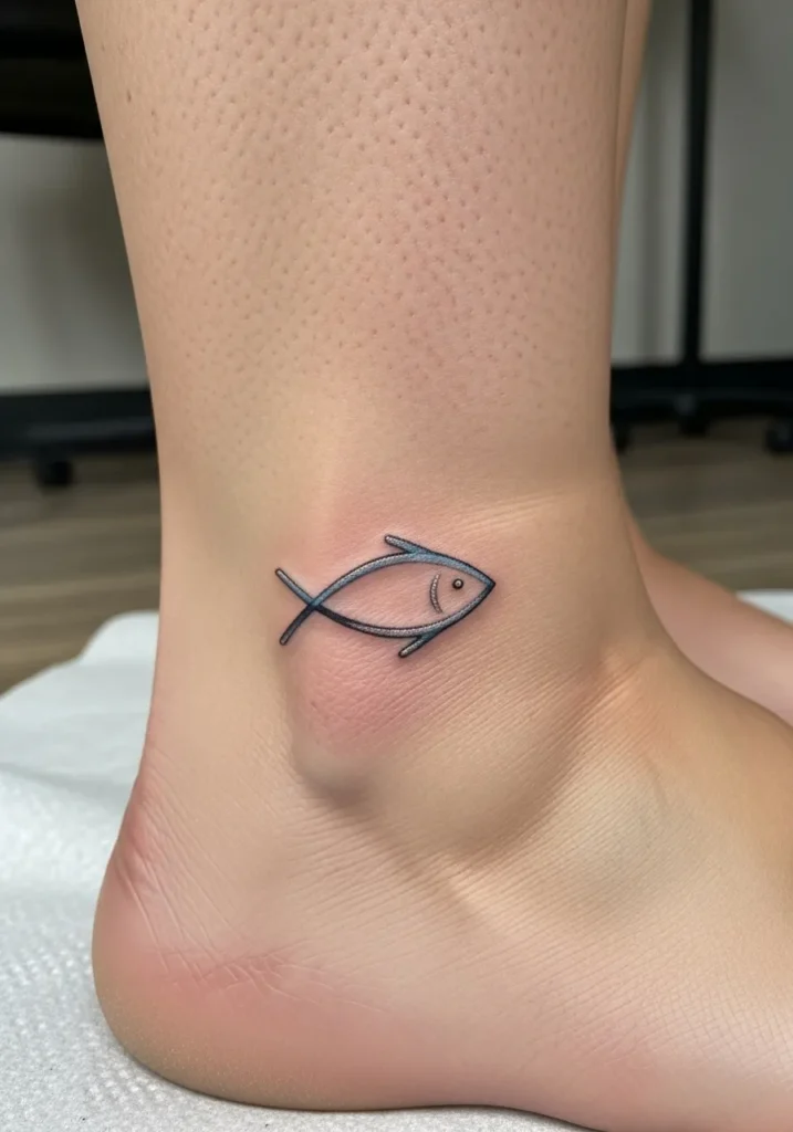This tattoo features a small ichthys fish symbol placed just above the ankle, created in fine line style with soft blue gray accents. The design is minimal and clean, with smooth curves that fit the ankle beautifully. Its small size makes it subtle but meaningful.