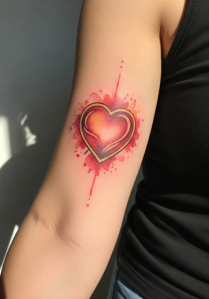 This tattoo shows a medium sized sacred heart on the upper arm, done in vibrant reds and warm gold tones. The heart is softly shaded with gentle rays and subtle glow details that give it warmth and depth. The placement allows the colors to stand out while still feeling balanced.