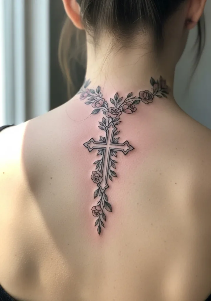 This tattoo runs along the upper back and spine, featuring a fine line cross surrounded by soft floral elements in muted pinks and greens. The vertical flow follows the natural line of the back, creating an elegant and graceful look. The size is medium, offering detail without feeling heavy.