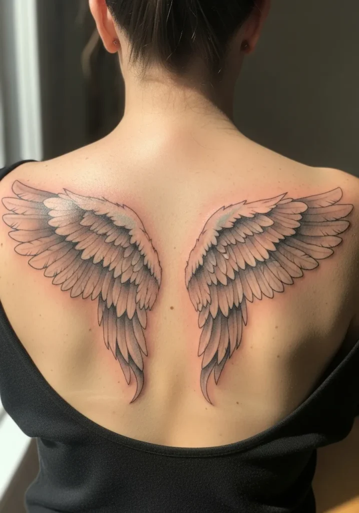 This tattoo features a pair of large angel wings spread across the upper back, done in fine line style with soft blush and gray shading. The feathers are detailed but still light, giving the wings a gentle and protective presence. The placement feels open and powerful without being overwhelming.
