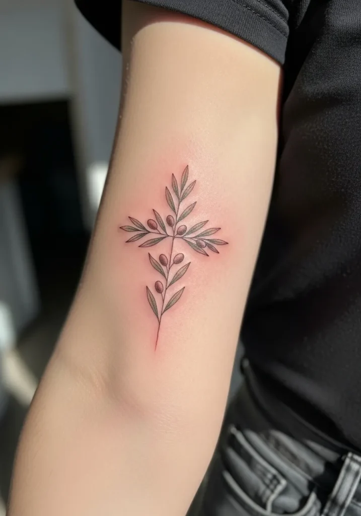 This tattoo shows a small to medium cross formed by olive branches on the outer forearm, created with fine lines and muted green tones. The leaves are simple and natural, giving the design an organic and peaceful feel. The placement makes it easy to admire without feeling too exposed.