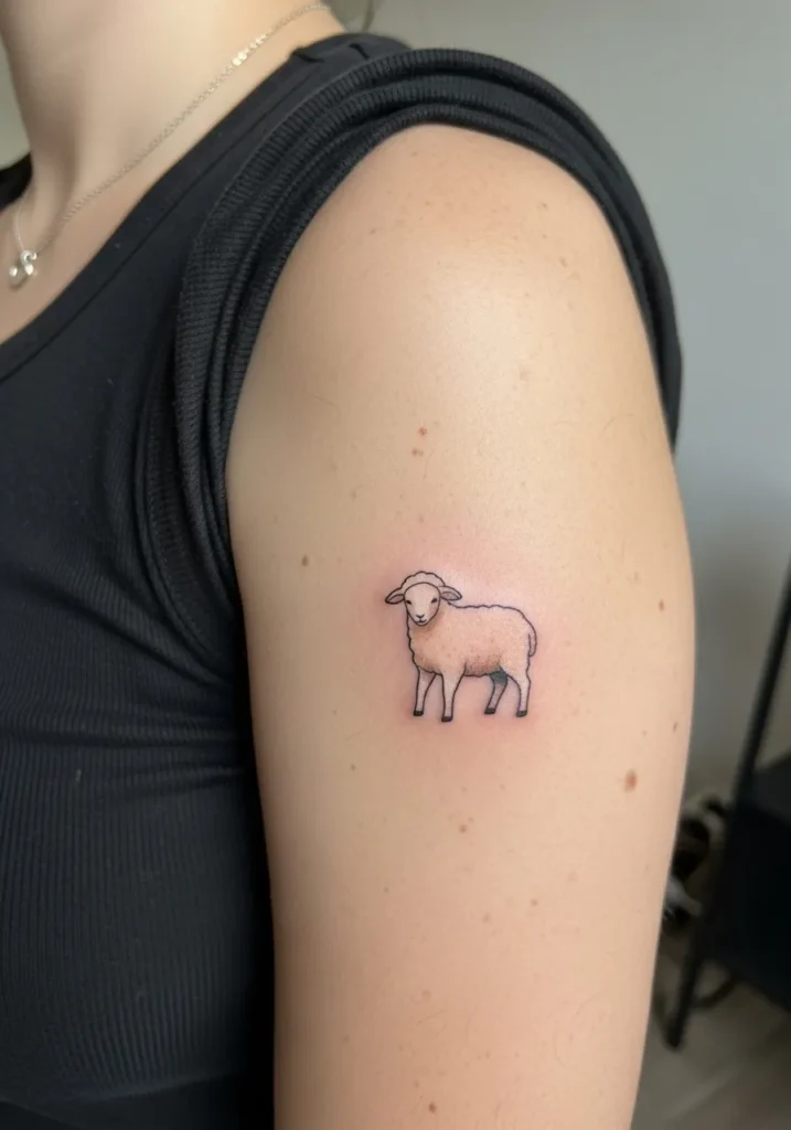 This tattoo features a small lamb placed on the upper arm, done in fine line style with soft beige and muted brown tones. The design is minimal and clean, with light shading that gives the lamb a calm and tender look. The size keeps it subtle and sweet, making it feel like a personal symbol rather than a statement piece.