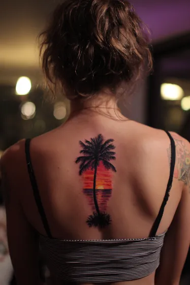 This absolutely stunning spine tattoo captures the serene beauty of a tropical sunset, featuring a bold black silhouette of a swaying palm tree at its center. The backdrop is a breathtaking blend of fiery oranges, soft reds, and deep purples, creating a vibrant sunset scene that beautifully reflects on the calm water below. The entire design is a vivid strip of paradise, perfectly aligned to flow gracefully down the back.
