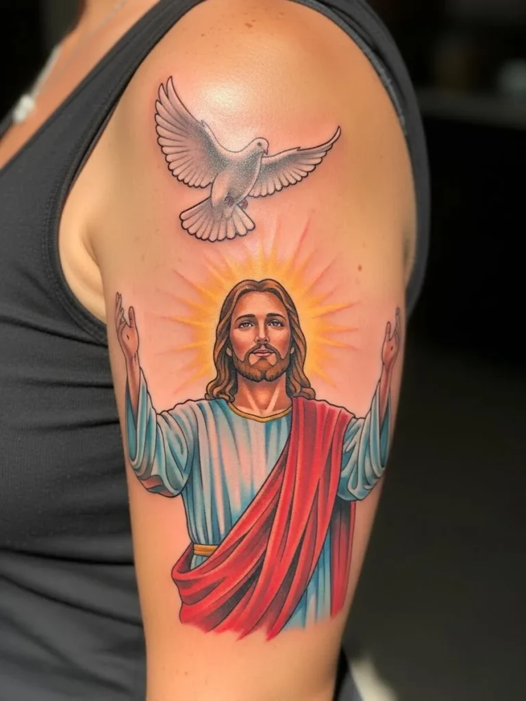 This is a medium sized colored tattoo placed on the upper arm, featuring Jesus with open arms and a dove above him.