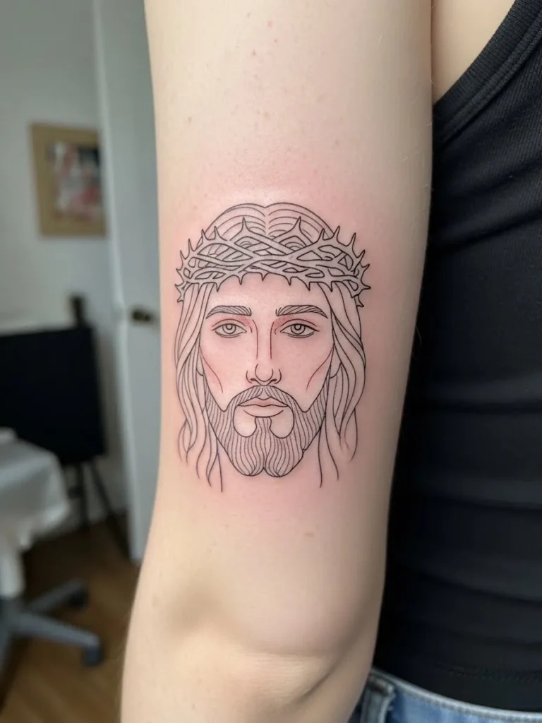 This tattoo features a smaller fine line Jesus portrait on the upper arm with a subtle crown of thorns detail.