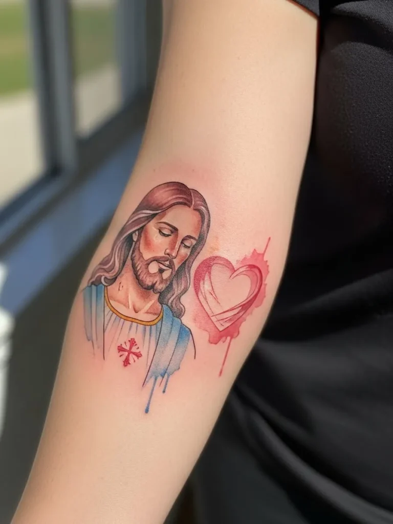 This design sits on the upper arm and combines a colored Jesus portrait with a hand drawn sacred heart element beside it.