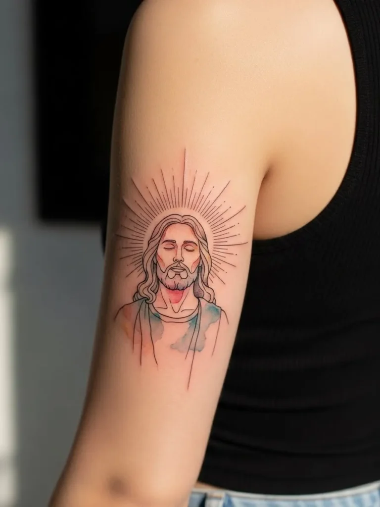 This design sits on the upper arm and shows a colored Jesus portrait surrounded by soft radiant lines forming a subtle halo effect.