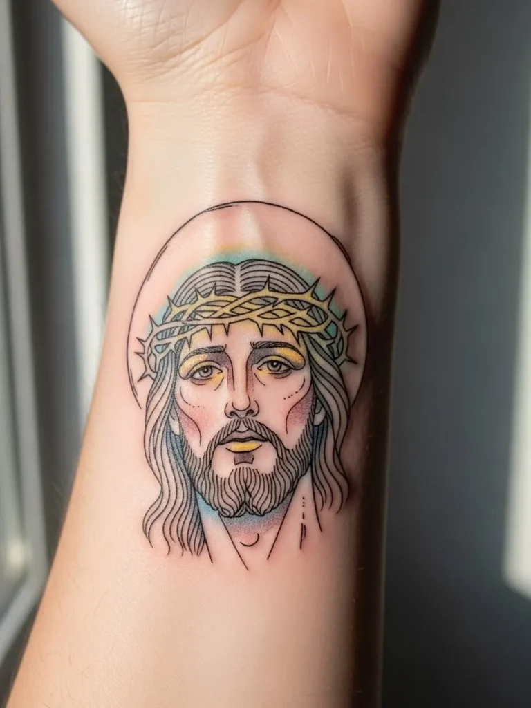 This tattoo is placed on the inner wrist and features a small to medium sized colored Jesus portrait with a delicate halo detail.