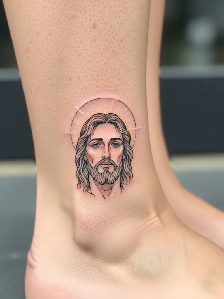 Here we have a small colored Jesus face tattoo placed delicately on the ankle, keeping the design refined and subtle.