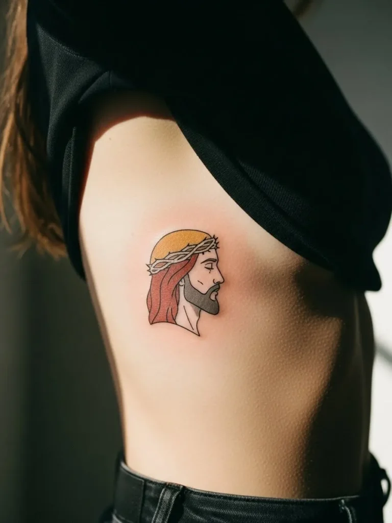 This design shows a small Jesus profile tattoo placed on the side of the ribcage, using smooth color blending and clean outlines.