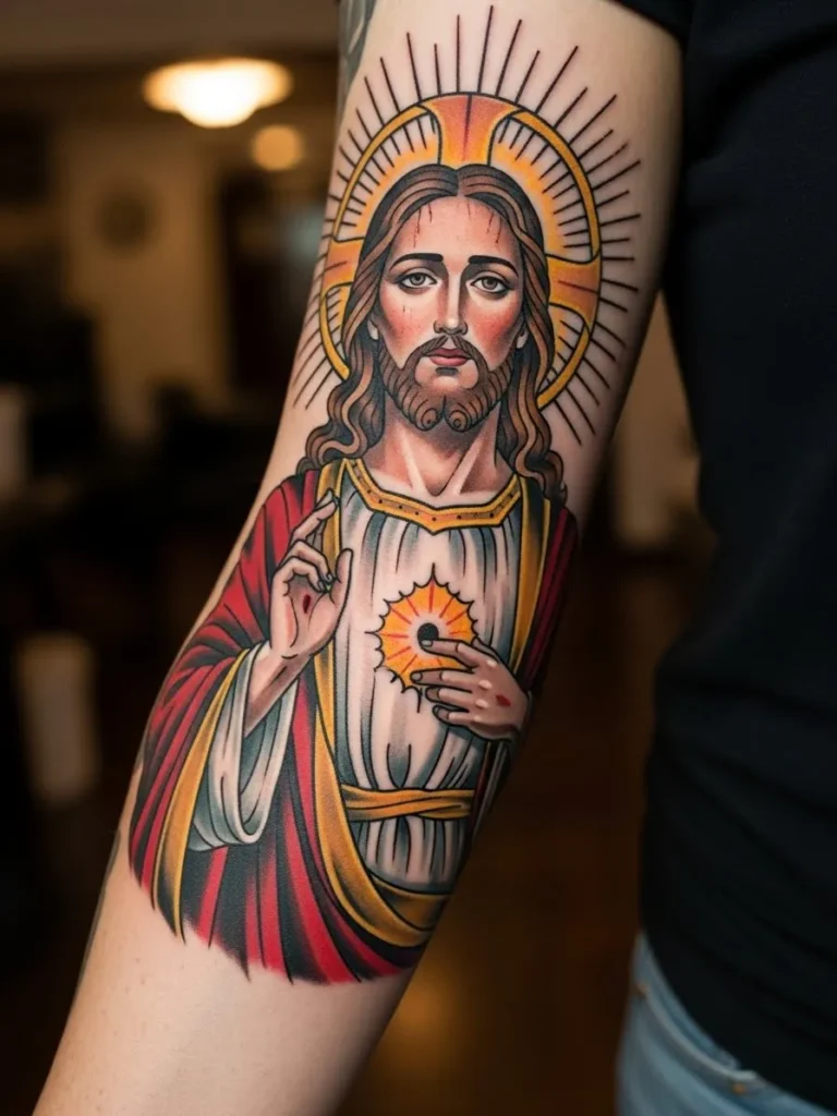 This is a medium to large tattoo on the forearm featuring Jesus with a radiant sacred heart, done in a classic colored style.