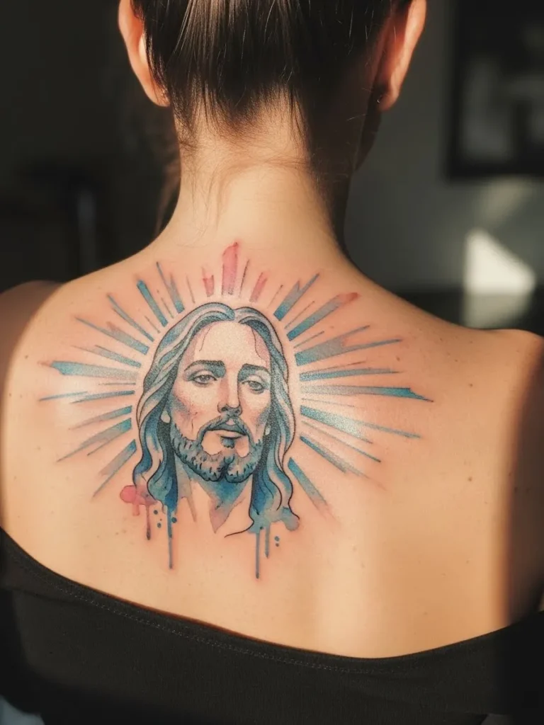 This tattoo is centered on the upper back and shows a colored Jesus portrait surrounded by soft radiant lines.