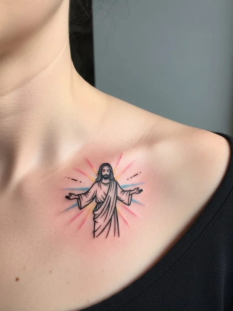 This tattoo sits beautifully along the collarbone and shows a small colored Jesus figure with soft radiant lines spreading outward.