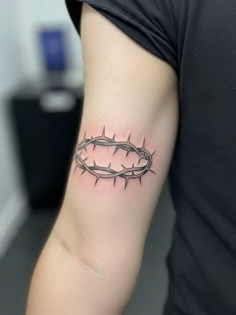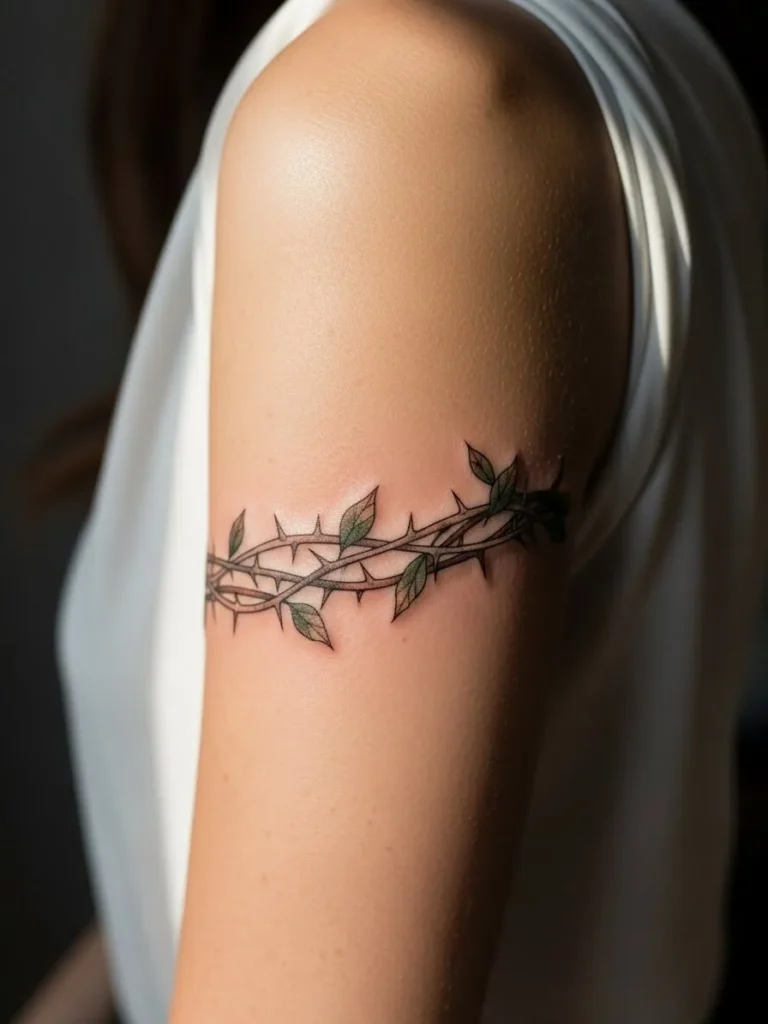 This tattoo sits snugly around the upper arm like a soft band, featuring a fine line crown of thorns with subtle shading in muted brown and green tones. The size is medium, wrapping just enough to feel intentional without overwhelming the arm. The clean modern linework keeps it minimal, while the placement makes it feel strong and grounded.