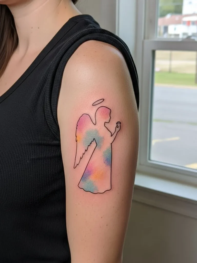 This medium sized tattoo sits on the outer upper arm and features an angel silhouette filled with soft watercolor hues in blush, blue, and warm peach tones. The outline stays clean and minimal, while the color brings warmth and personality. The placement gives it enough space to breathe and really shine.