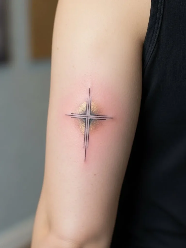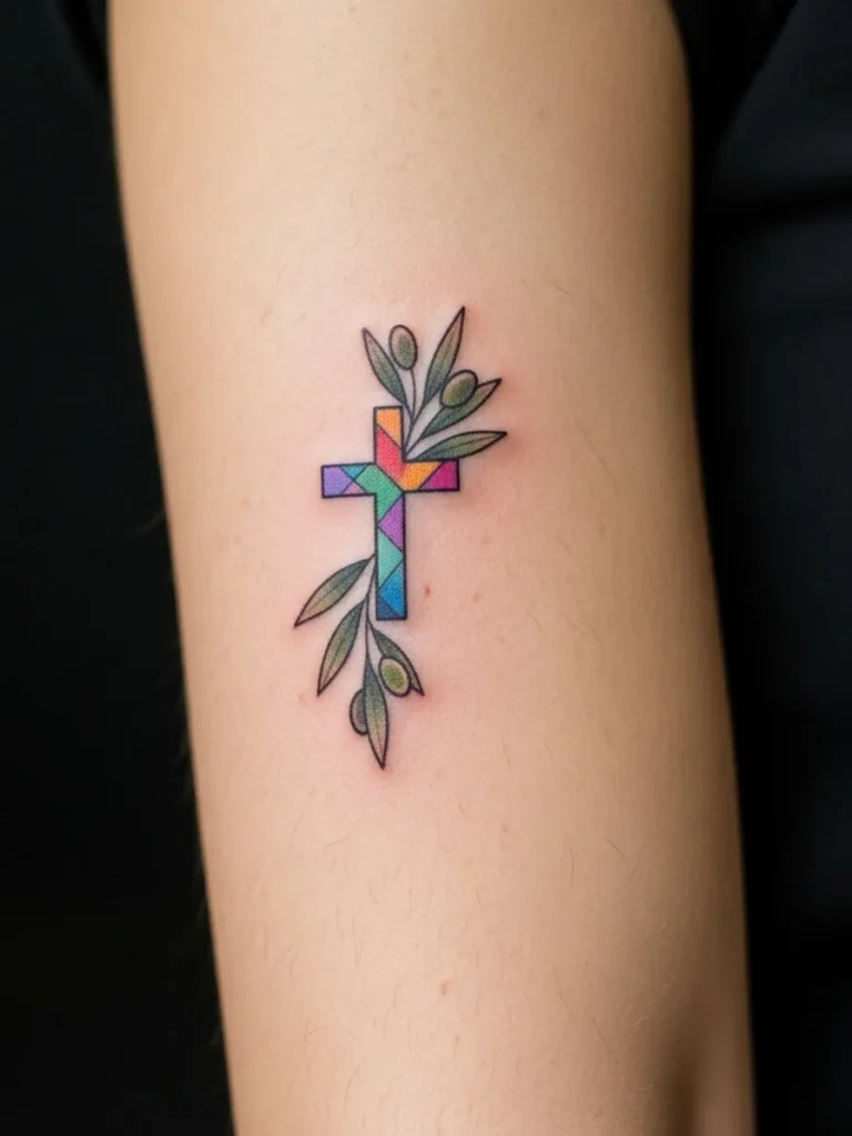 This slim cross tattoo is placed on the outer arm and designed with fine lines and a soft pastel glow effect around it. The size is small to medium, keeping it elegant and understated. The gentle color adds dimension without taking away from the clean modern look.