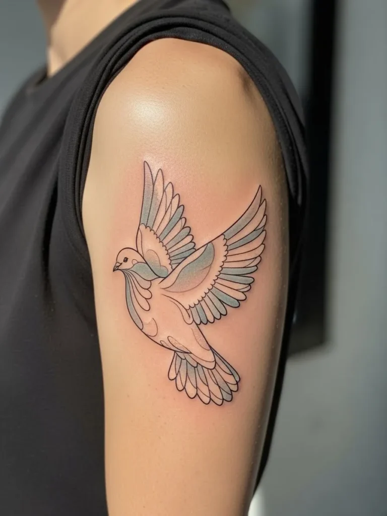 Placed on the outer upper arm, this medium sized dove tattoo shows the bird mid flight with soft pastel blues and gentle peach tones in the wings. The fine line work keeps everything crisp, while the light shading gives it movement without losing that clean modern look. It sits beautifully on the arm and feels balanced from every angle.
