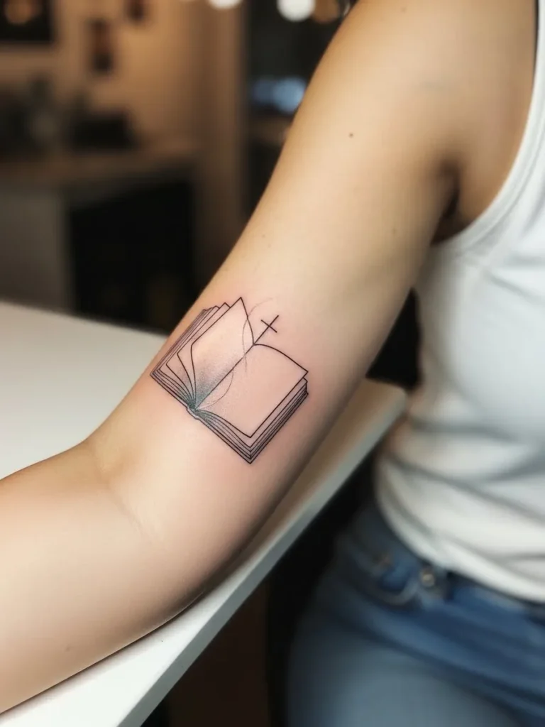 This small to medium tattoo sits on the inner arm just above the elbow, featuring a simple open Bible drawn with fine black lines and soft beige shading. The design is airy and modern, with lots of breathing room so it never feels crowded. Its size makes it subtle, yet meaningful.