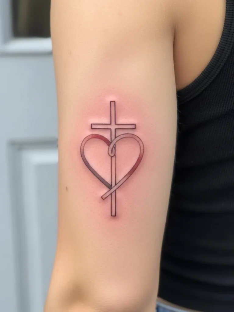 Placed on the outer arm, this medium sized tattoo combines a slim cross with a heart outline, shaded softly in warm pink and muted red tones. The lines are clean and modern, with subtle depth that gives it a polished but approachable look. It sits comfortably without overpowering the arm.