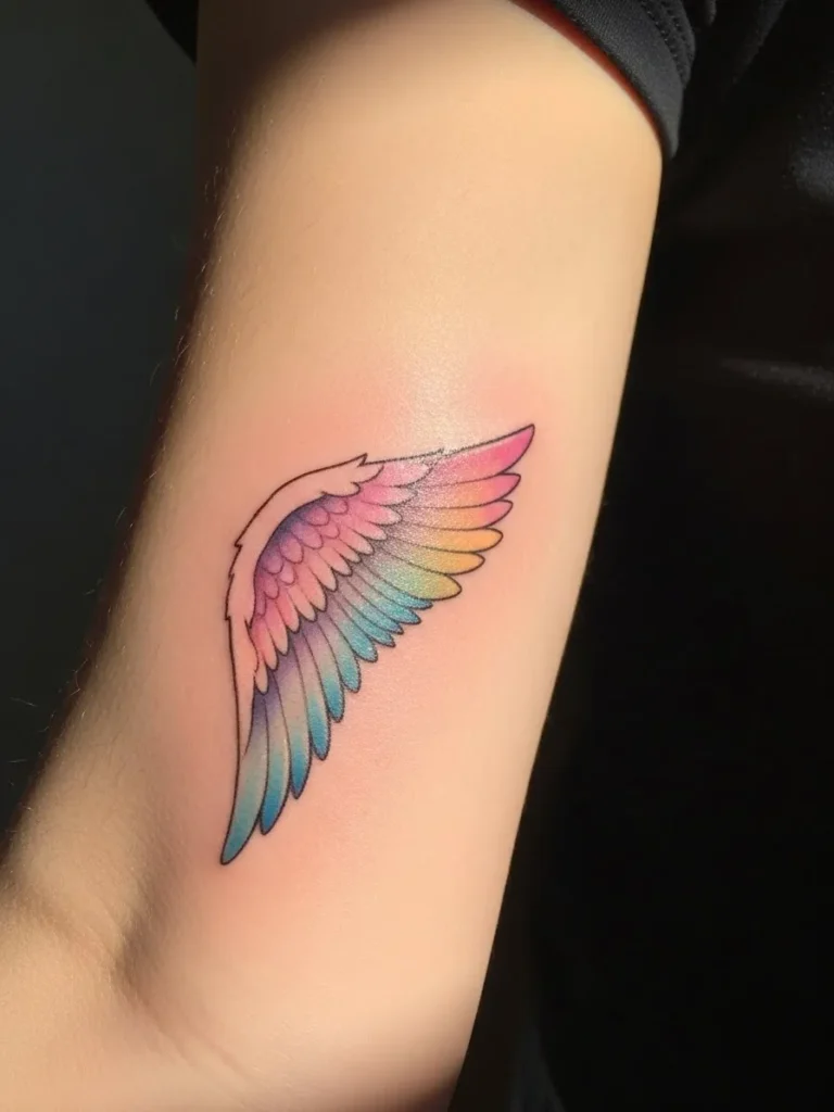 This tattoo is positioned on the outer forearm and features a single angel wing with soft gradient coloring that shifts from pastel blue to gentle pink. The fine line detailing keeps the feathers crisp, while the color adds just enough drama. It is medium sized and beautifully balanced on the arm.