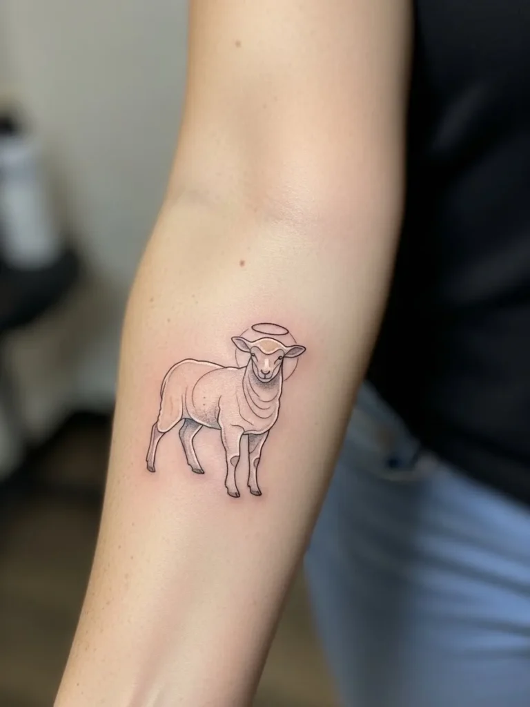 Sitting on the inner forearm, this small to medium lamb tattoo is done in delicate fine lines with soft cream and light gray tones. The design is minimal and clean, with just enough detail to feel intentional without looking busy. Its placement makes it feel personal and close.