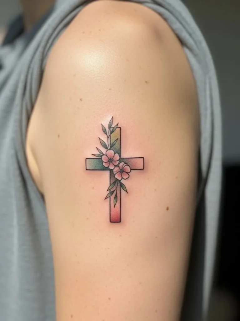 This tattoo sits on the outer upper arm and features a classic cross wrapped with small flowers in muted pinks and soft green leaves. The fine line style keeps it modern, while the gentle color palette adds warmth and femininity. The size is medium, making it noticeable without feeling overpowering.
