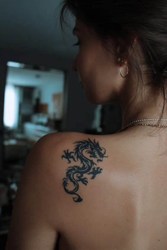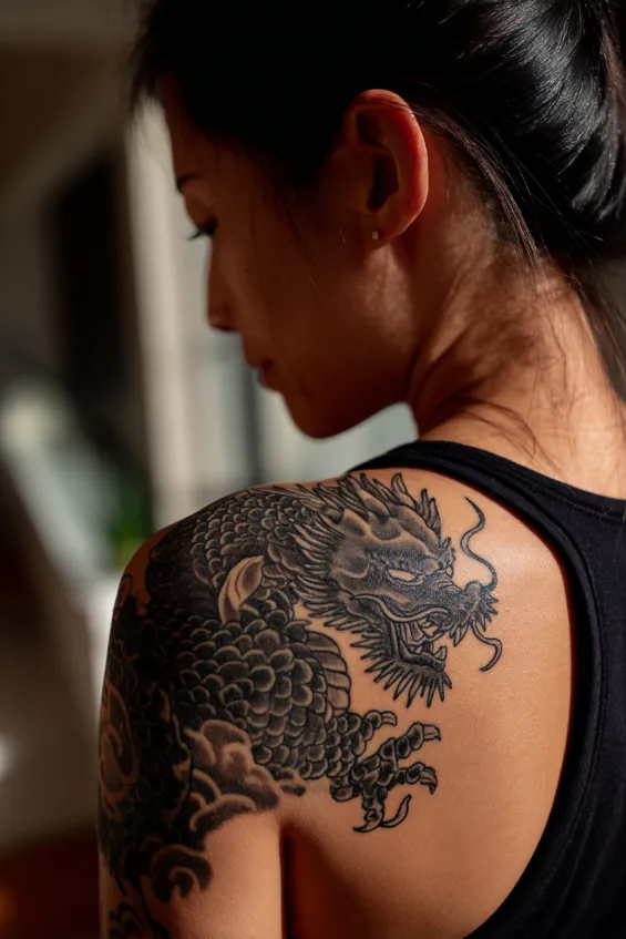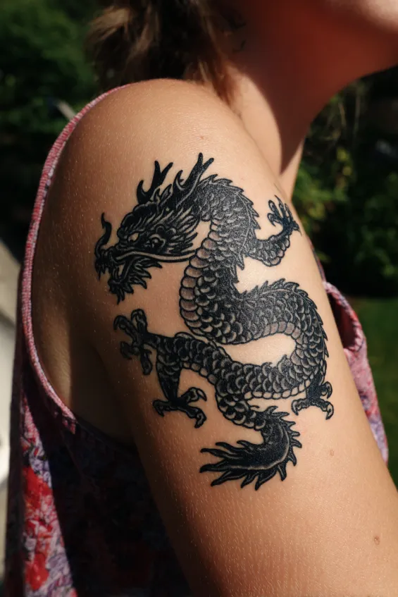 This shoulder tattoo shows a detailed black dragon perched across a woman’s upper shoulder and slightly onto the back. The design uses bold outlines and layered shading to create dimension in the scales and wings. It is medium in size but feels impactful thanks to its placement.
